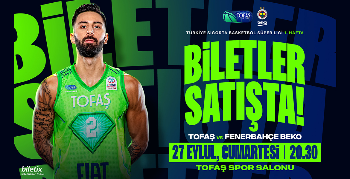 TOFAŞ Basketbol Takımımız, Türkiye Sigorta Basketbol Süper Ligi’nde 2025-2026 sezonunun açılış haftasında Fenerbahçe Beko’yu ağırlayacak. Yeni sezonda Coach Emil Rajkovic yönetiminde yenilenen kadrosuyla parkeye çıkacak olan Mavi Yeşilliler, ilk hafta karşılaşmasında taraftarının ve Bursalı basketbol severlerin desteğini beklerken, 27 Eylül Cumartesi günü Nilüfer TOFAŞ Spor Salonu’nda oynanacak mücadele saat 20.30’da başlayacak. Karşılaşmanın biletleri biletix.com’dan (online satış) ve Biletix perakende satış noktalarından satışa sunulurken, maç günü salon bilet gişesi saat 14.00’den itibaren açık olacak.