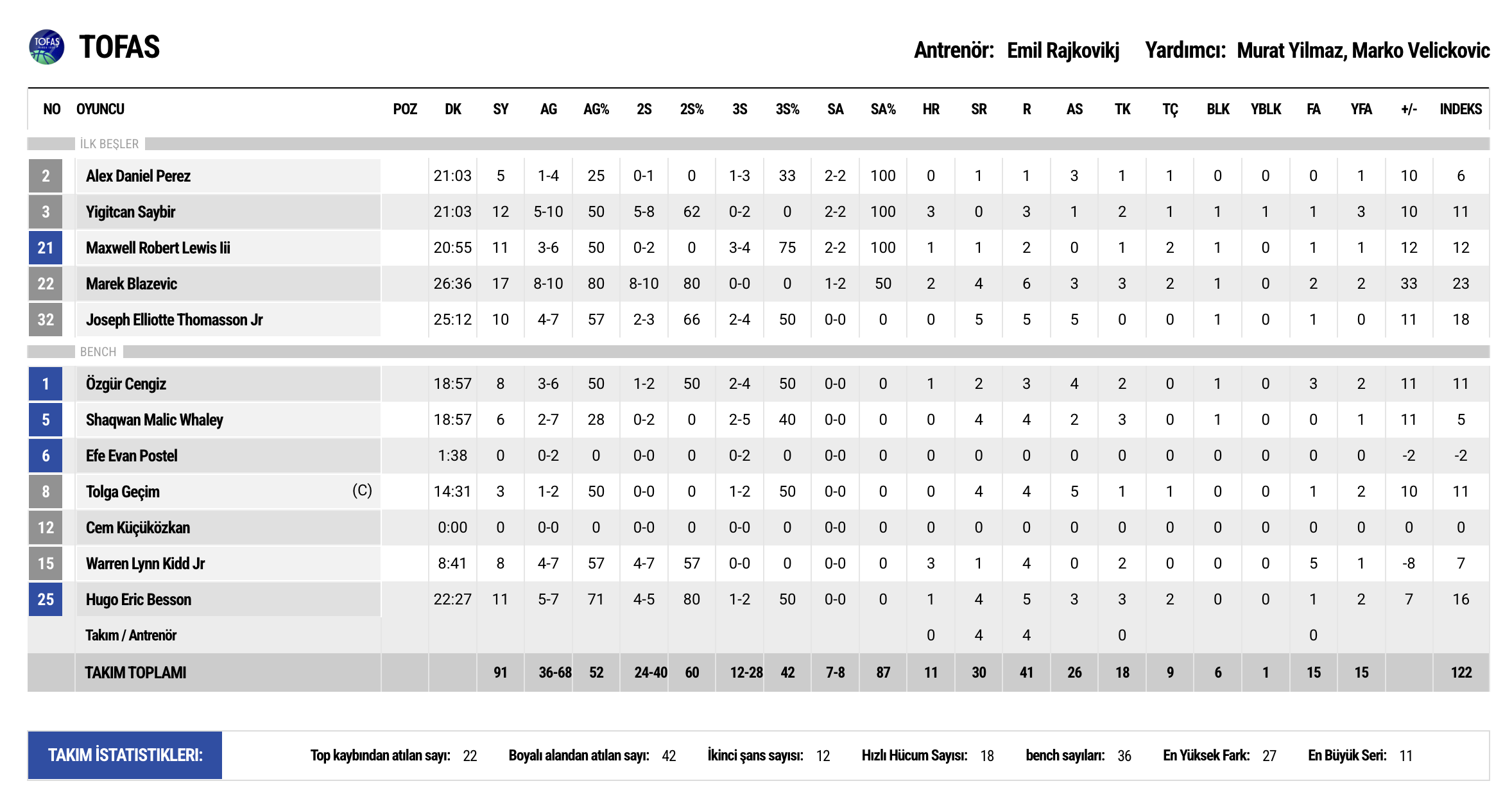 Büyükçekmece karşısında TOFAŞ’ta Marek Blazevic 17 sayı; Yiğitcan Saybir 12 sayı; Maxwell Lewis 11 sayı; Hugo Besson 11 sayı ve Joe Thomasson 10 sayı kaydetti.
