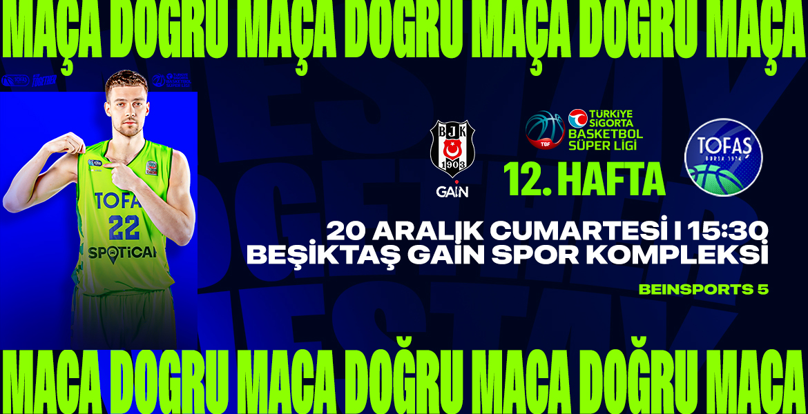 TOFAŞ Basketbol Takımımız, ligin 12. hafta mücadelesinde deplasmanda Beşiktaş GAİN ile karşı karşıya geliyor. 20 Aralık Cumartesi günü Beşiktaş GAİN Spor Kompleksi’nde oynanacak maç saat 15.30’da başlayacak ve BeIN SPORTS 5’ten canlı yayınlanacak.