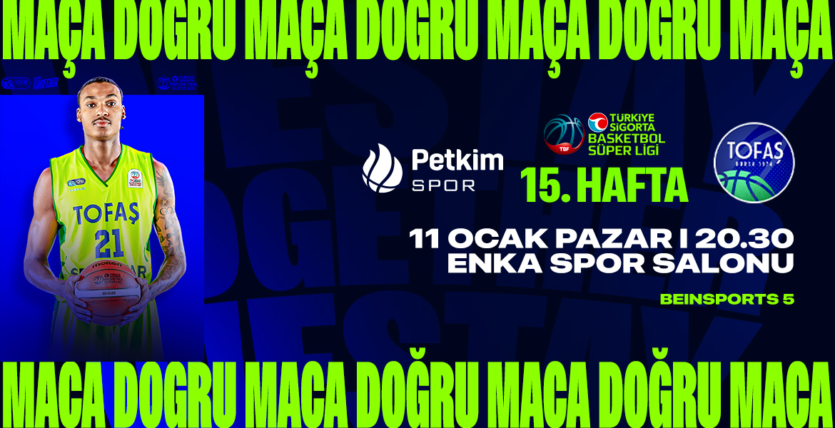Türkiye Sigorta Basketbol Süper Ligi 15. hafta mücadelesinde takımımız TOFAŞ, deplasmanda Aliağa Petkimspor ile karşı karşıya geliyor. Geride kalan 14 haftada 7 galibiyet-7 mağlubiyet ve ilk yarının son haftasına 8. sırada giren Bursa ekibi, İzmir deplasmanında ligde sezonun ilk deplasman galibiyetine imza atmayı hedeflerken; Mavi Yeşilliler bu maçı kazanması durumunda devreyi ilk 8 içinde tamamlayarak Türkiye Kupası oynamaya hak kazanacak.