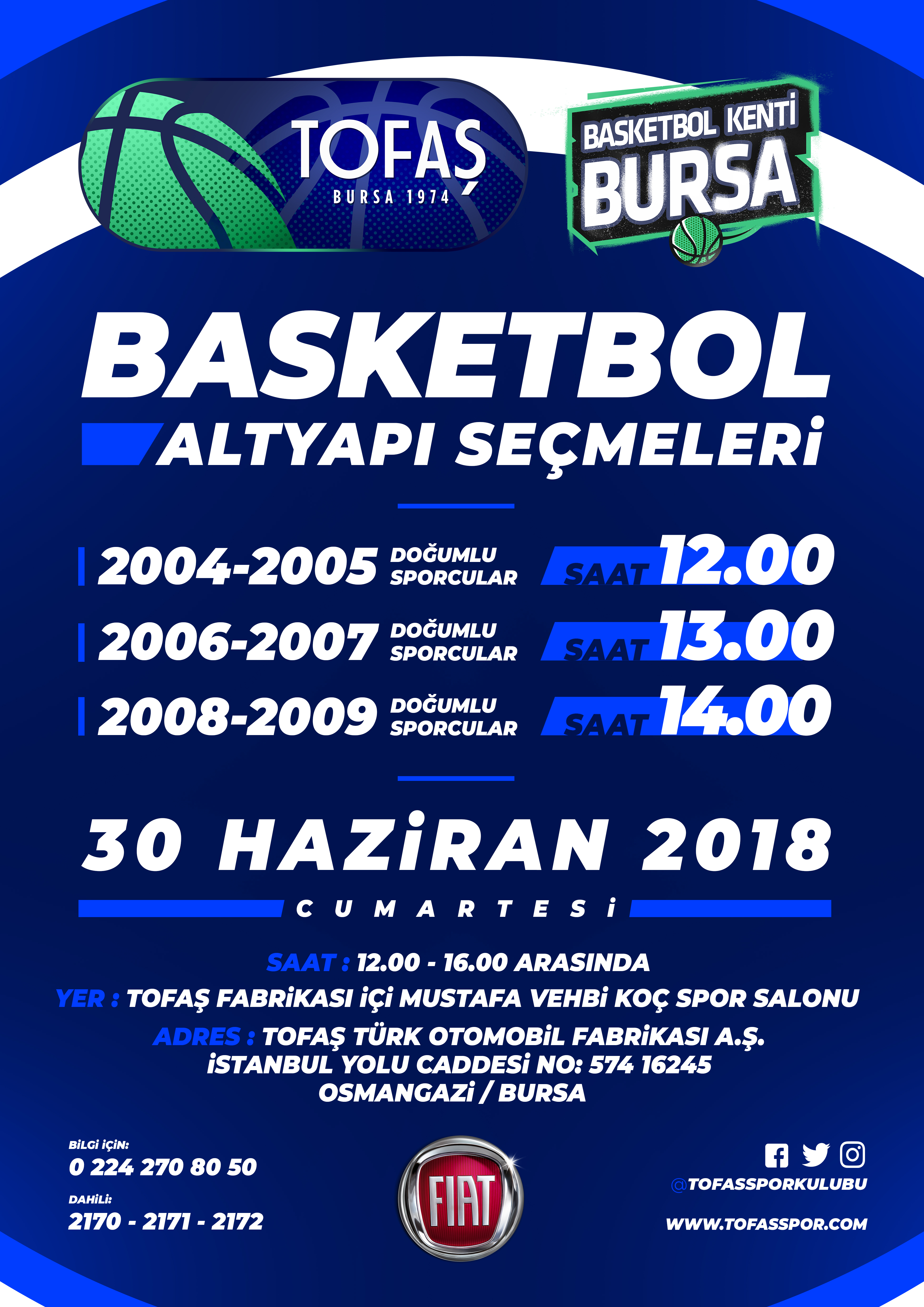 Altyapıya yapmış olduğu yatırımlarla Türk basketbolunun köklü kulüplerinden olan TOFAŞ, yeni yeteneklerini arıyor. 2004-2009 doğumlu erkek sporcuların katılabileceği seçmeler 30 Haziran Cumartesi günü 12.00-16.00 saatleri arasında altyapı antrenörlerimizin nezaretinde TOFAŞ Fabrikası içerisinde yer alan TOFAŞ Mustafa V. Koç Spor Salonu'nda gerçekleştirilecektir. Seçmeye gelecek olan sporcular antrenmana kendi spor kıyafetleriyle katılacaktır. Yaş gruplarına göre seçme saatleri aşağıdaki gibidir;