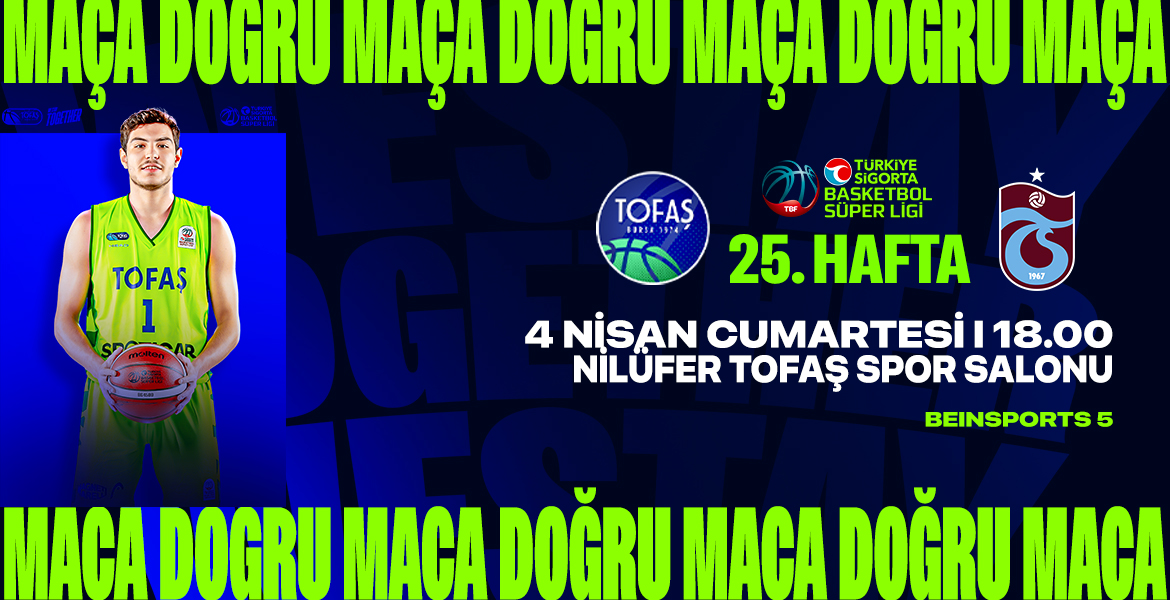TOFAŞ Basketbol Takımımız, Türkiye Sigorta Basketbol Süper Ligi 25. hafta karşılaşmasında sahasında Trabzonspor Basketbol ile kozlarını paylaşacak. 4 Nisan Cumartesi günü TOFAŞ Spor Salonu’nda oynanacak karşılaşma saat saat 18.00’de başlayacak.