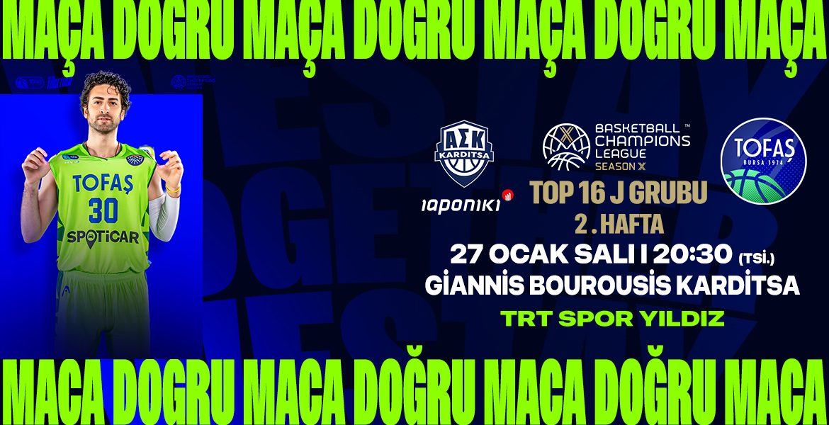 TOFAŞ Basketbol Takımımız, Basketbol Şampiyonlar Ligi TOP 16 turu J Grubu 2. haftasında deplasmanda Yunan temsilcisi Karditsa Iaponiki ile karşılaşacak. 27 Ocak Salı günü Giannis Bourousis Karditsa’da oynanacak maç TSİ 20.30’da başlayacak.