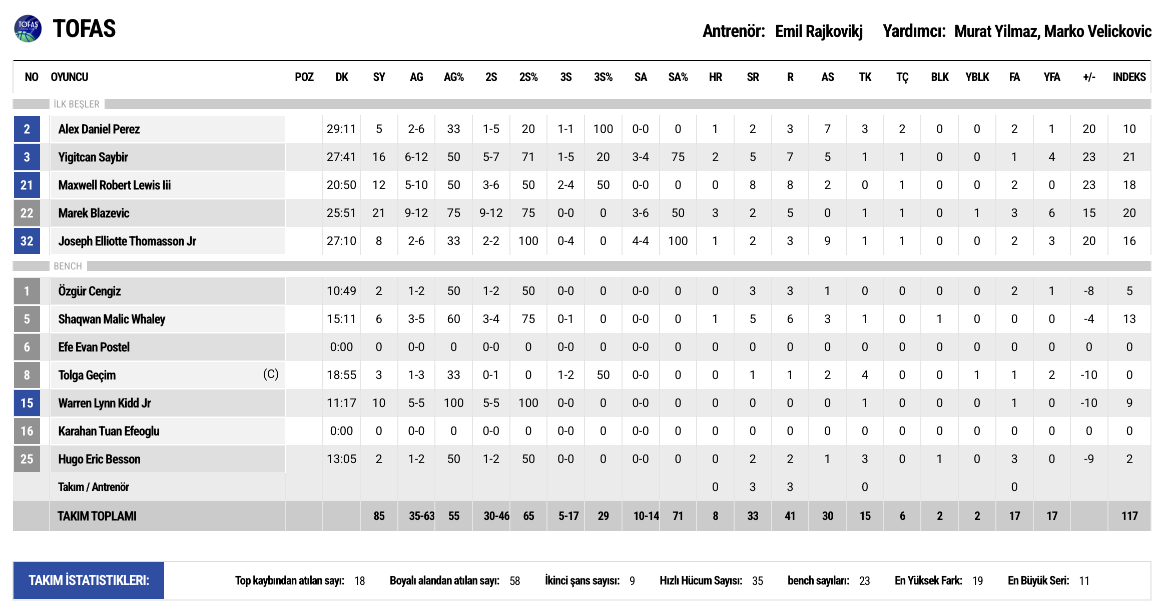 Türk Telekom karşısında TOFAŞ’ta Marek Blazevic 19 sayı; Yiğitcan Saybir 16 sayı; Maxwell Lewis 12 sayı ve Lynn Kidd 10 sayı kaydetti.