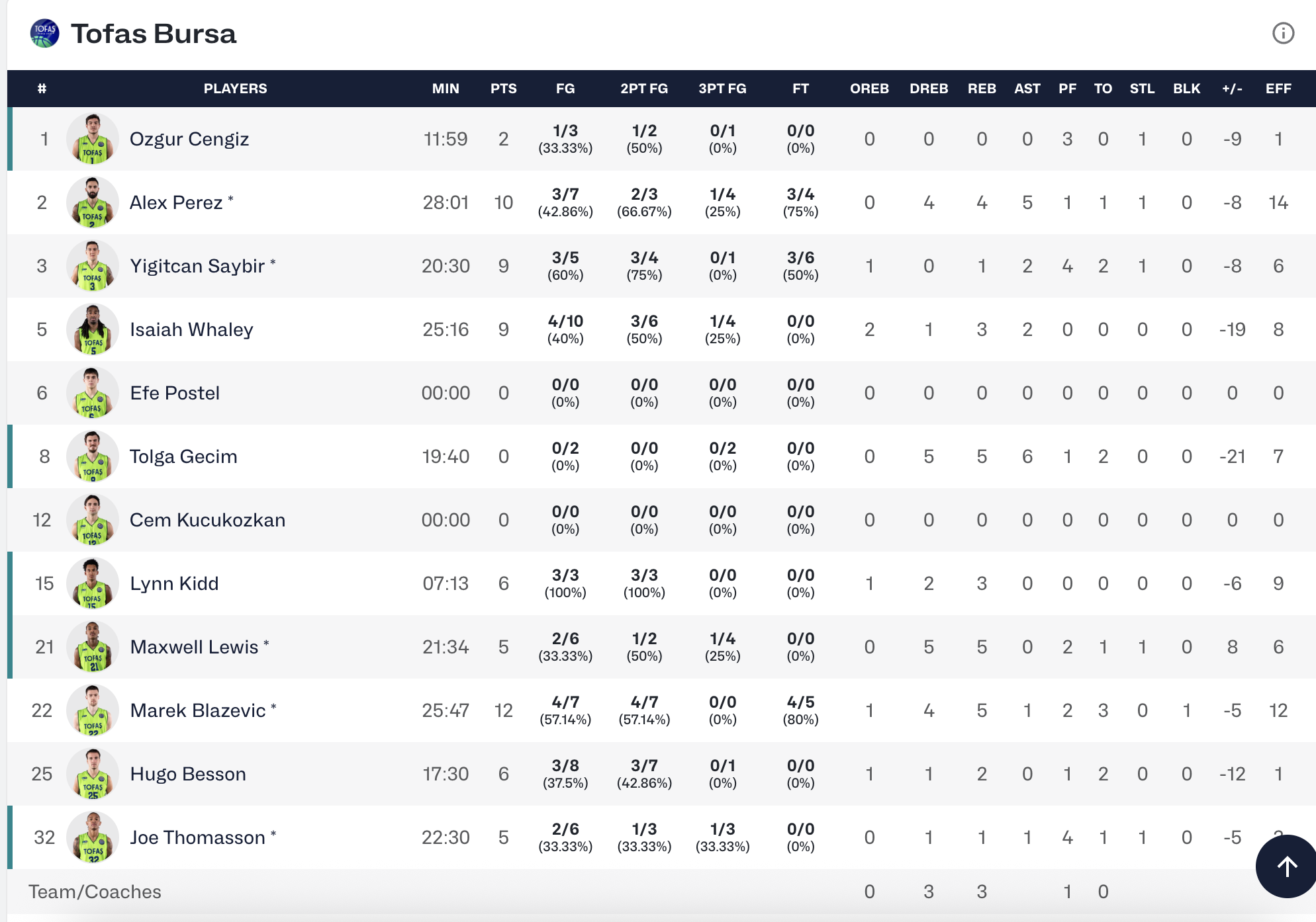 La Laguna Tenerife karşısında TOFAŞ’ta Marek Blazevic 12 sayı ve Alex Perez 10 sayıyla maçı çift hanelerde tamamlayan isimler oldu.