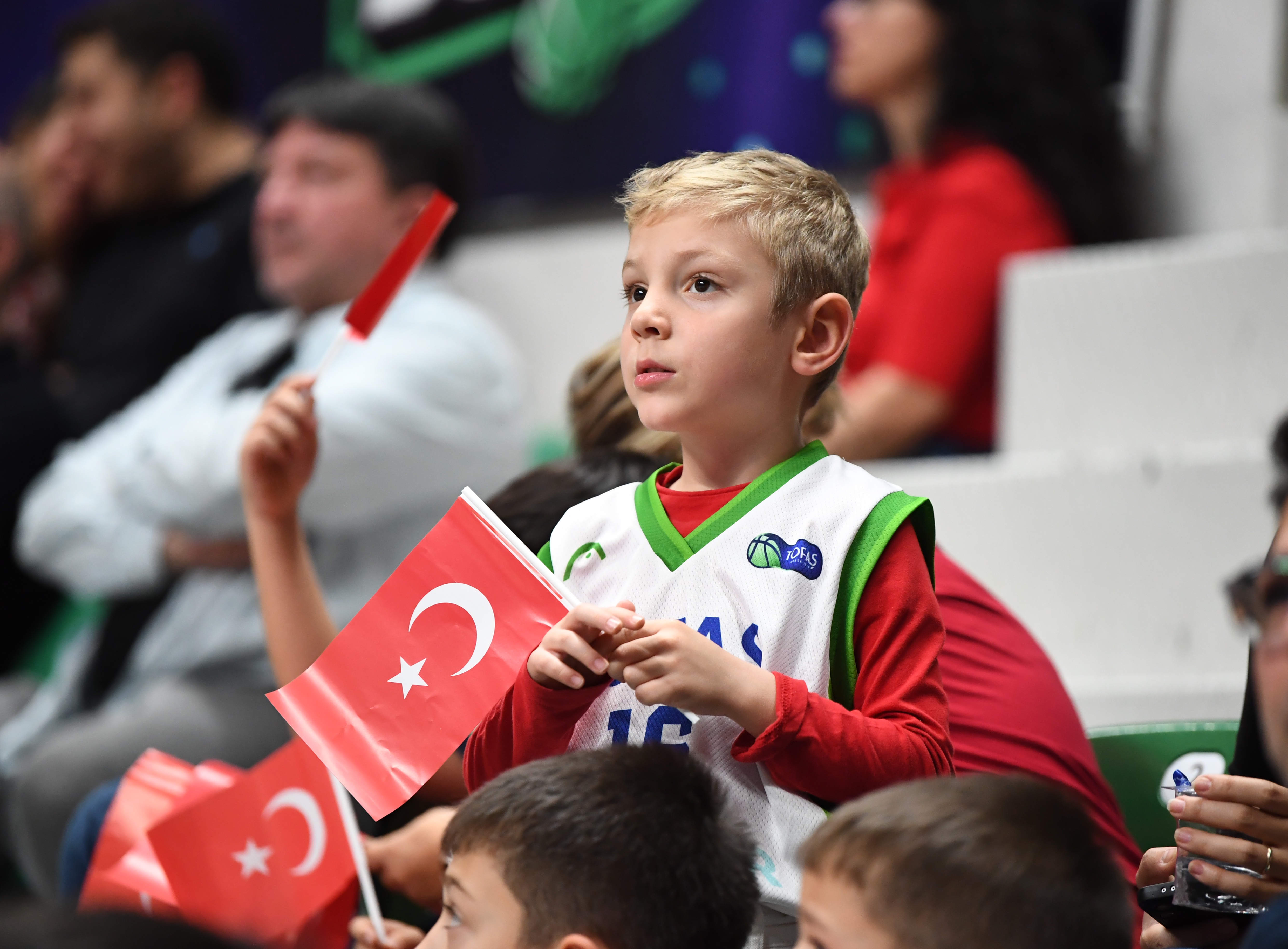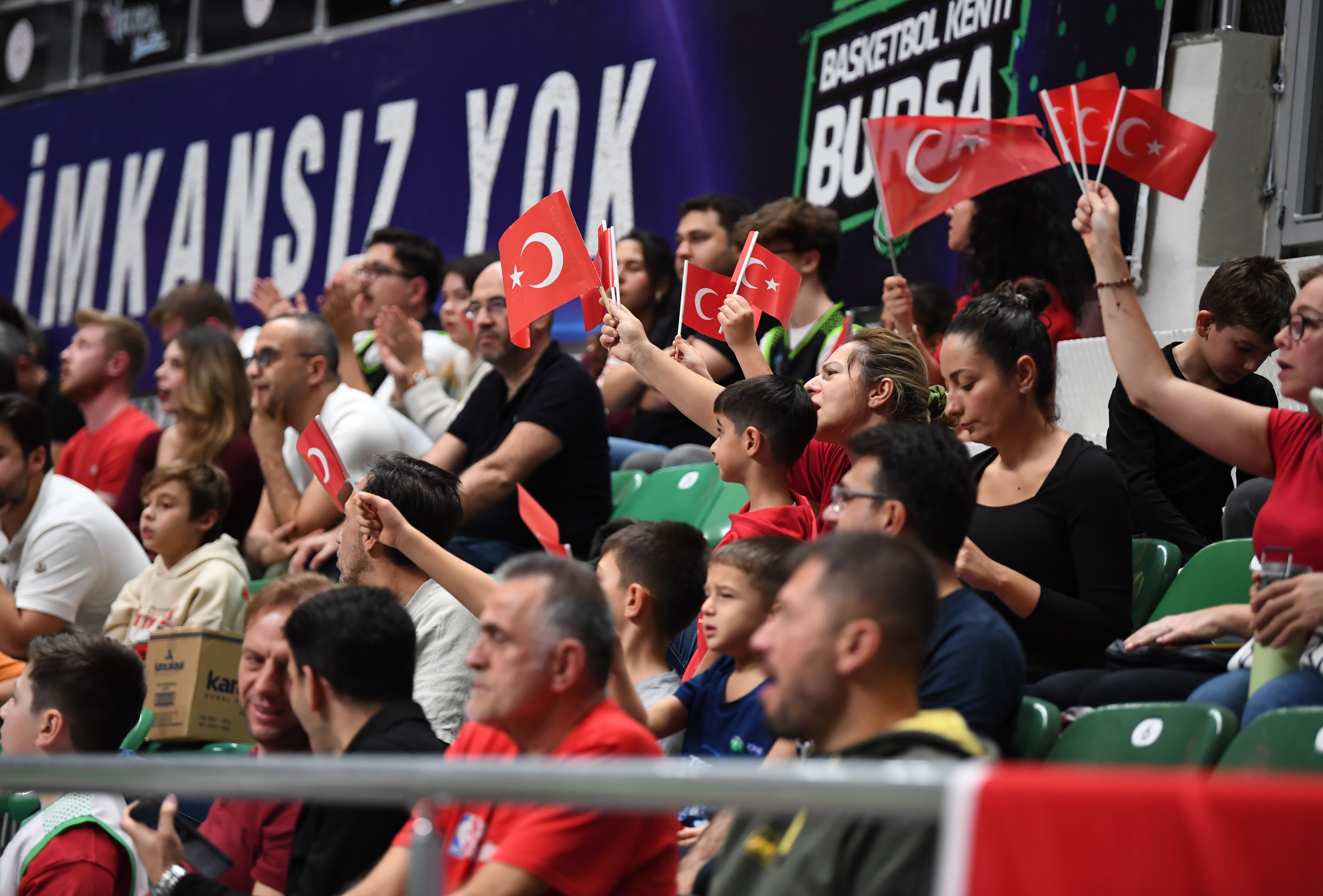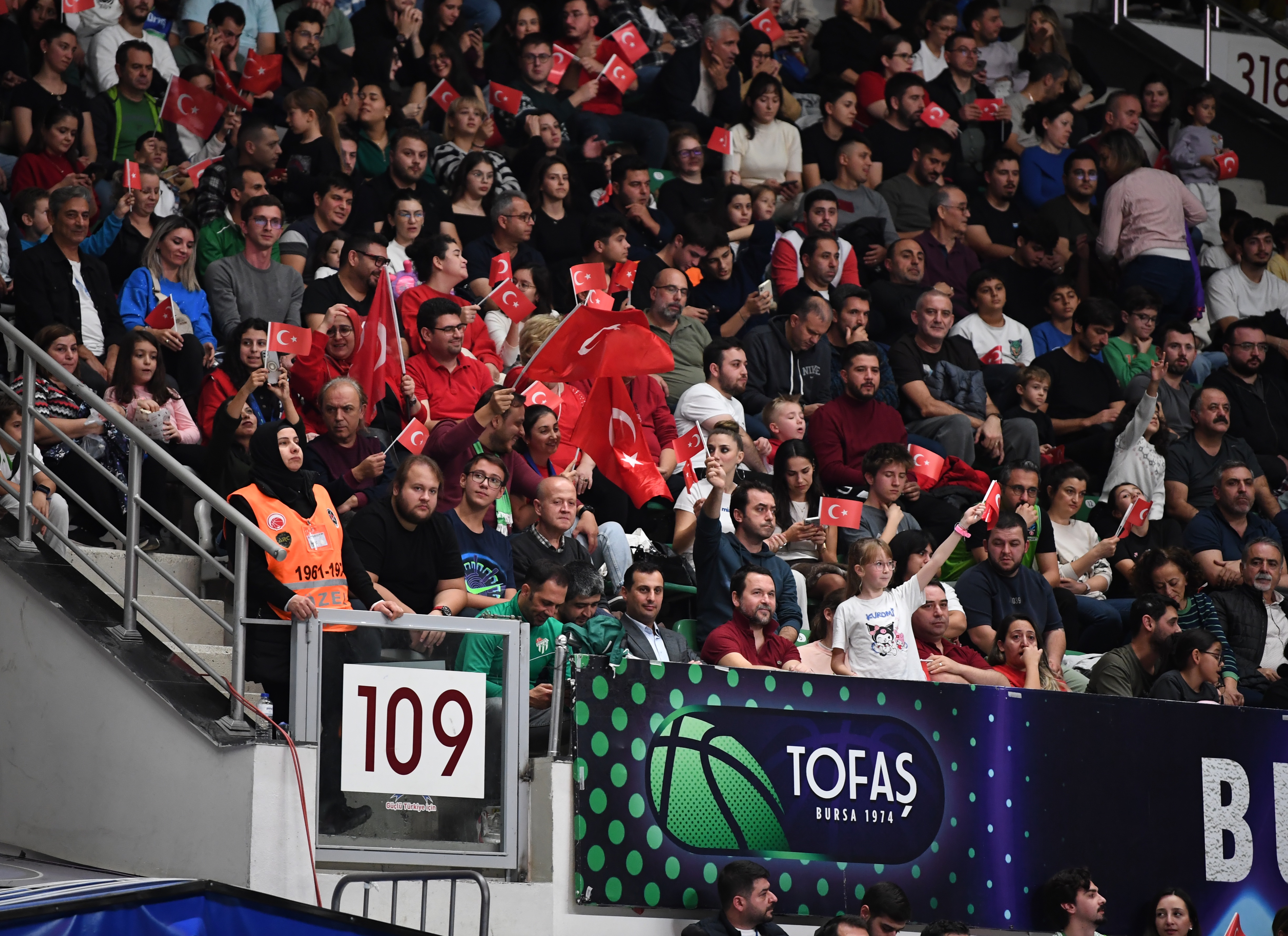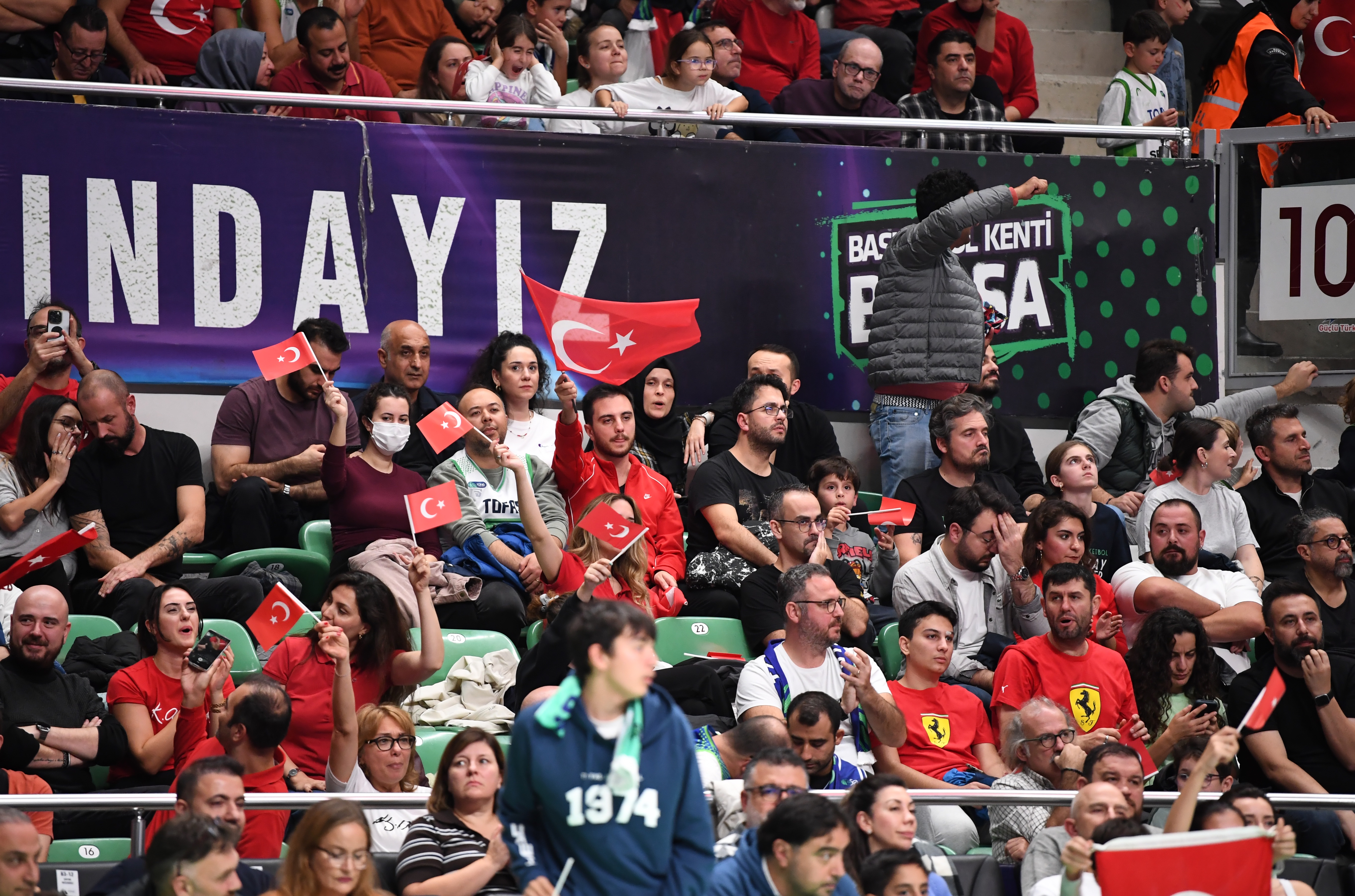 TOFAŞ – La Laguna Tenerife karşılaşması aynı zamanda Cumhuriyetimizin kuruluşunun 102. yıl dönümü kutlama etkinliklerine sahip oldu. 29 Ekim Cumhuriyet Bayramı öncesinde Tofaş Spor Salonu Ay Yıldızlı Bayraklarımızla süslenirken, Bursalı basketbol severler de giydikleri kıyafetlerle tribünleri Türk Bayrağı renklerine boyadı. “Ne mutlu Türküm diyene” pankartı açan taraftarlar, karşılaşma boyunca bando eşliğinde milli marşları hep bir ağızdan söyledi.