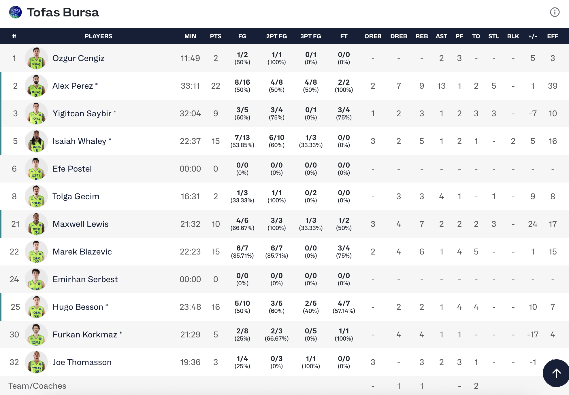 Trapani Shark karşısında TOFAŞ’ta 22 sayı-13 asist-9 ribaund ile triple-double’ı kıl payı kaçıran Alex Perez maçın adamı olurken; Hugo Besson 16 sayı; Isaiah Whaley ve Marek Blazevic ise 15’er sayıyla katkı verdi. Lynn Kidd sakatlığı nedeniyle kadroda yer almadı.