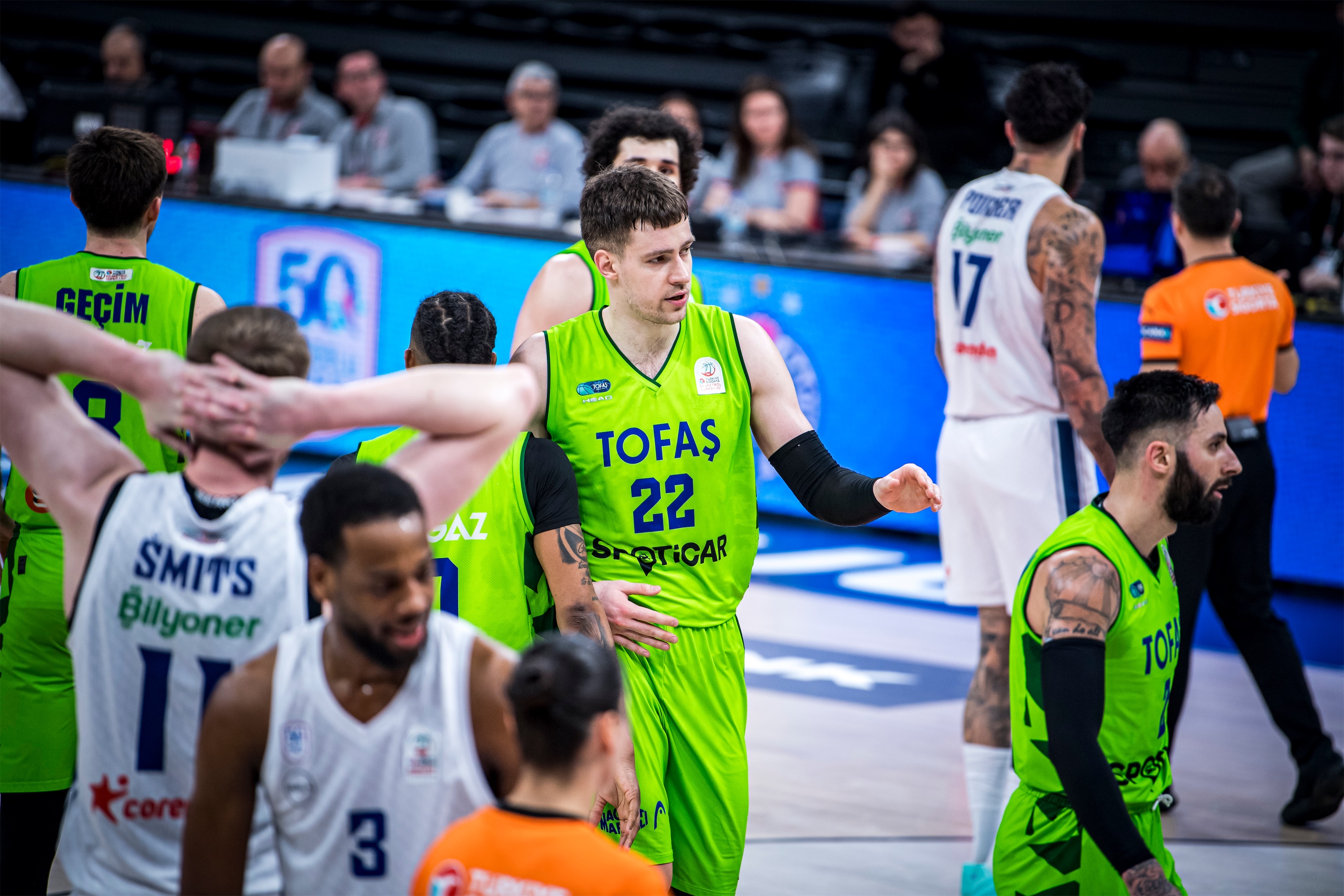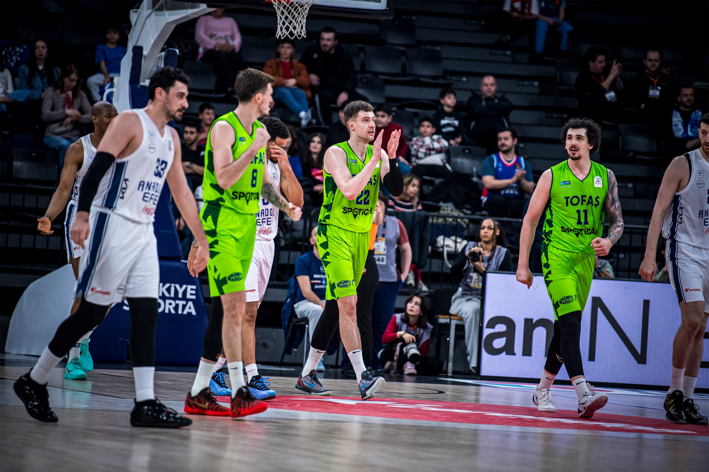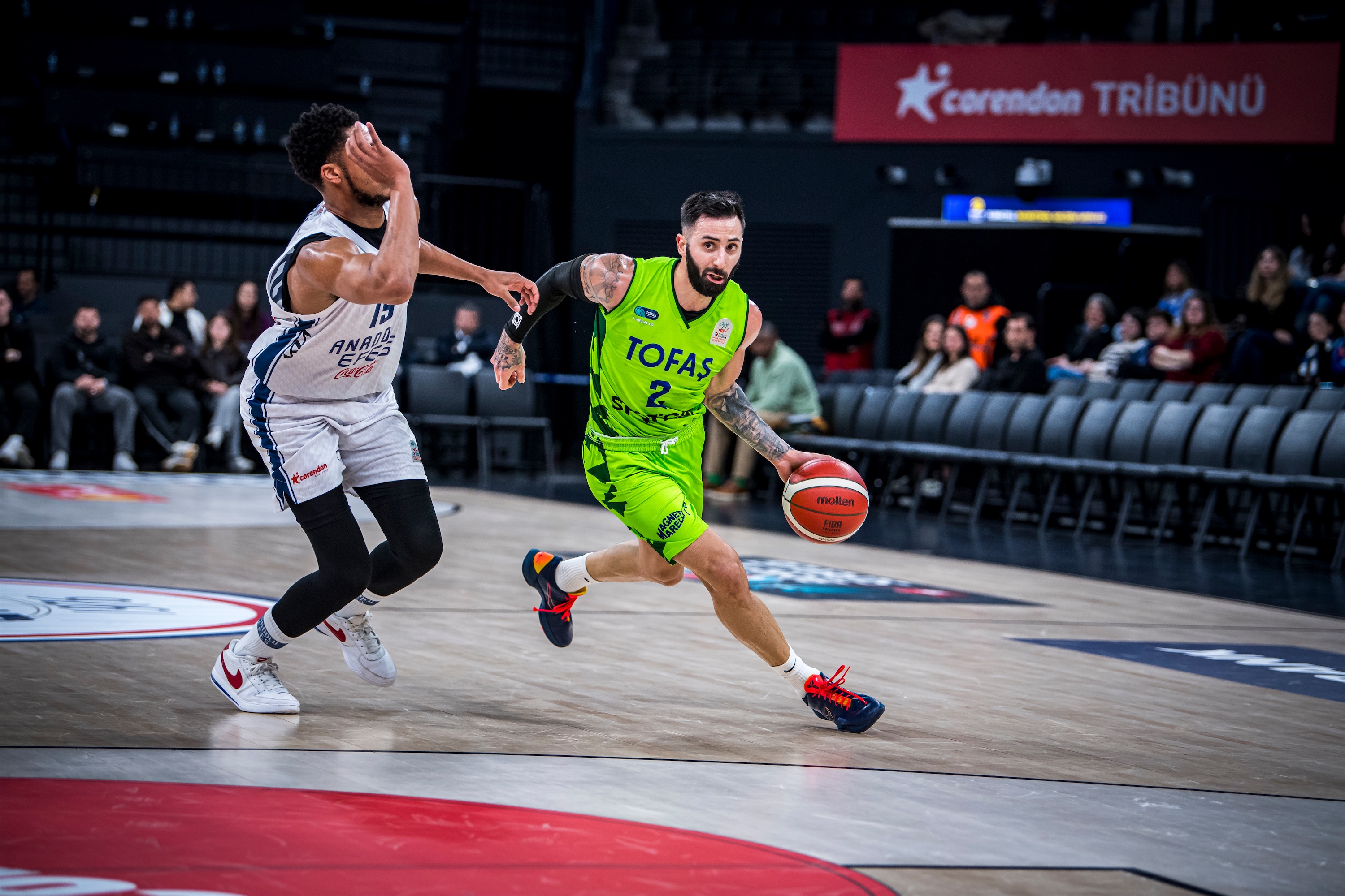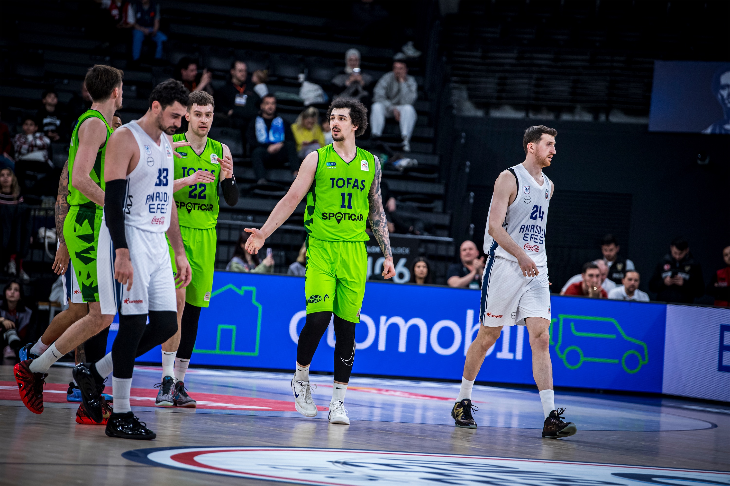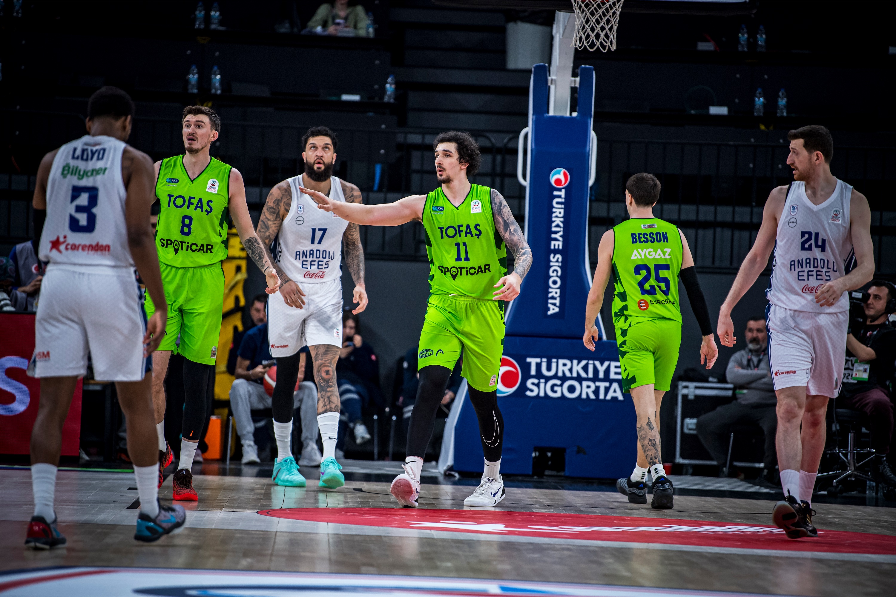 Türkiye Sigorta Basketbol Süper Ligi 24. haftasında TOFAŞ, Anadolu Efes’e konuk oldu. Turkcell Basketbol Gelişim Merkezi’nde oynanan mücadeleye Alex Perez, Hugo Besson, Tolga Geçim, Sadık Emir Kabaca, Marek Blazevic beşiyle başlayan Mavi Yeşilliler, ilk basketini Hugo Besson’un üçlüğüyle buldu. Alex Perez ve Marek Blazevic'in sayılarıyla 4. dakikayı 8-9 önde geçen Bursa ekibi, 5. dakikada televizyon molasına 14-9 geride girerken, mola dönüşü Marek Blazevic ve Sadık Kabaca’nın basketleriyle skoru 14-14 eşitleyen konuk takım, Marek Blazevic, Jordan Floyd, Tolga Geçim ve Furkan Korkmaz’ın sayılarıyla ilk çeyreği 21-21 beraberlikle kapattı.