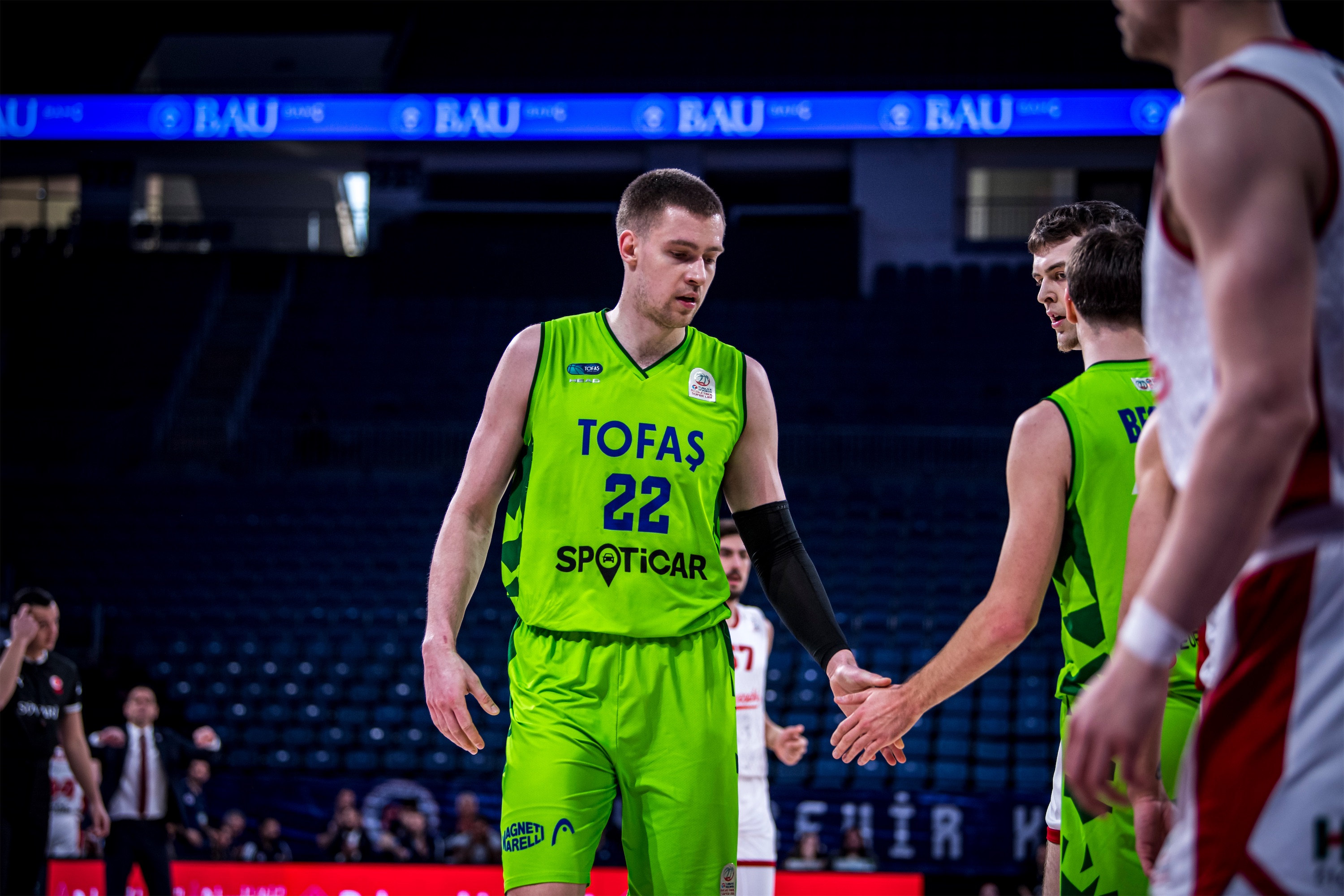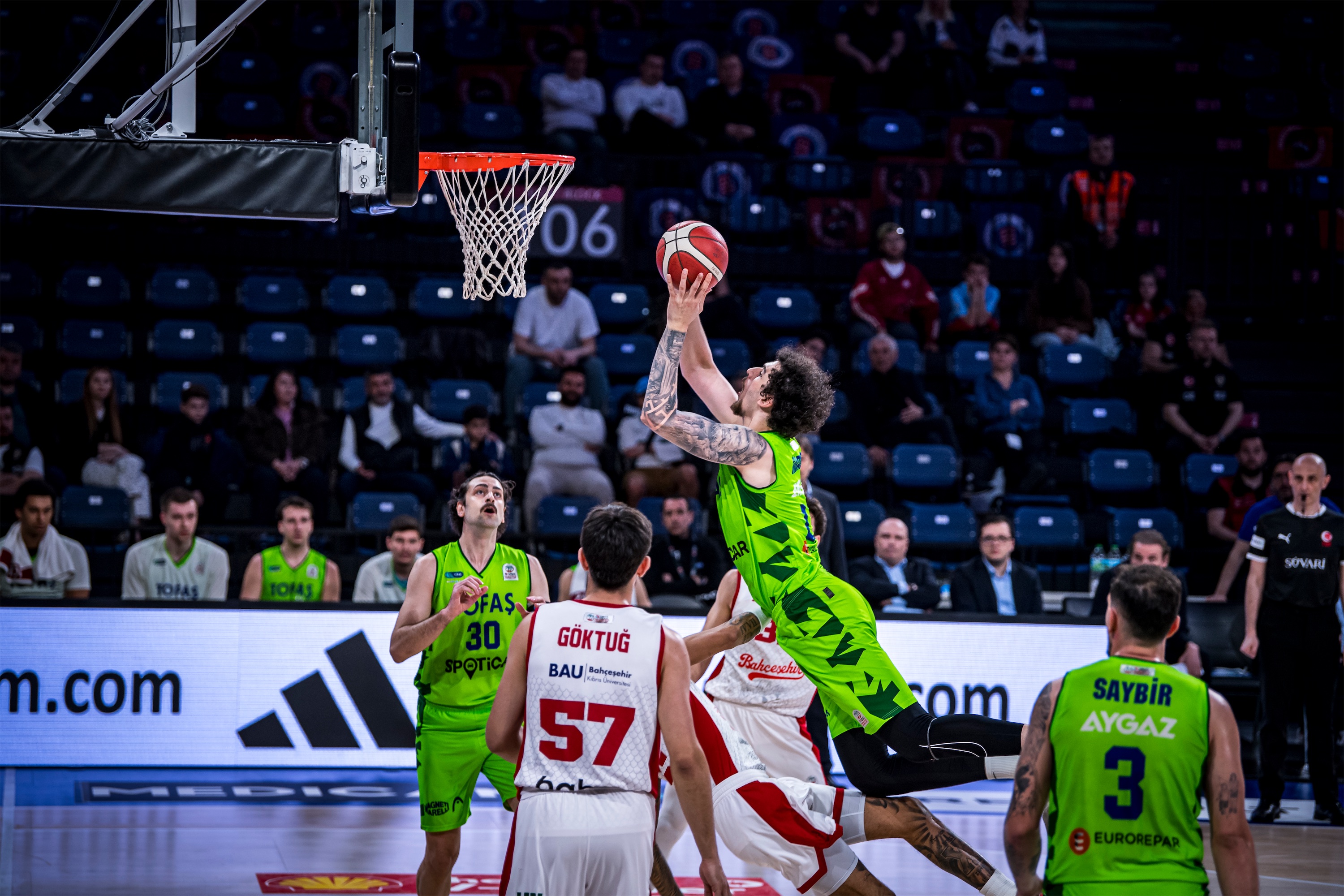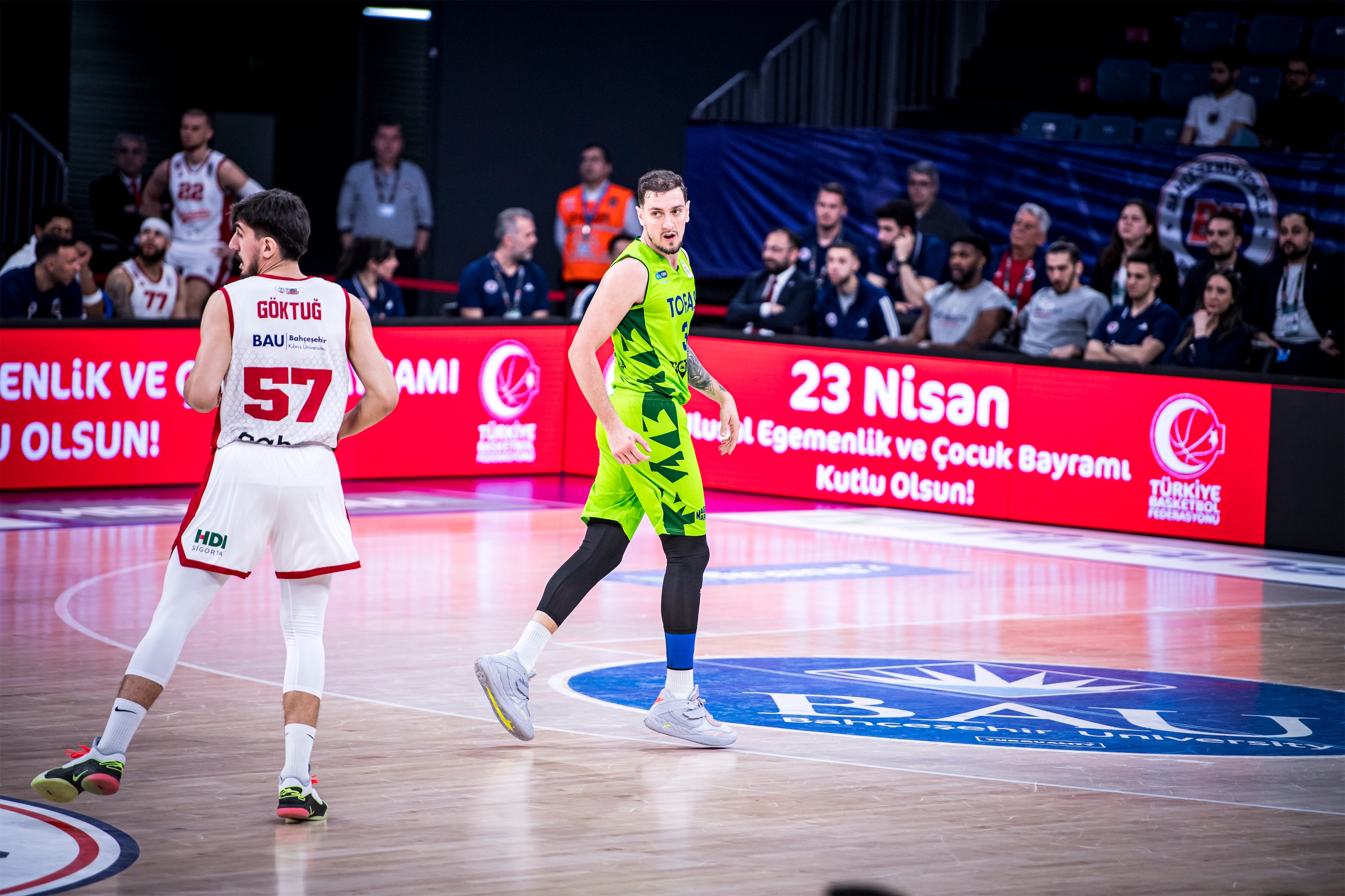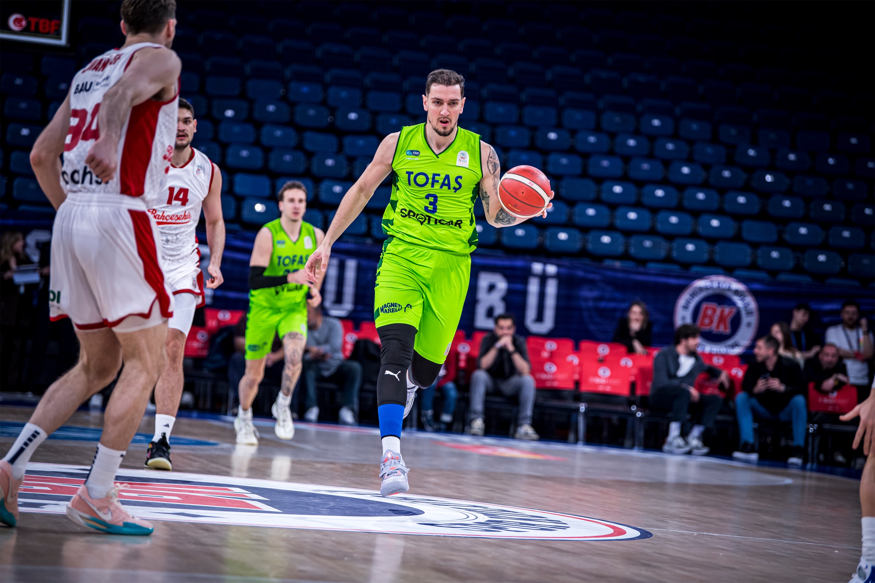 Türkiye Sigorta Basketbol Süper Ligi 28. haftasında takımımız TOFAŞ, Bahçeşehir Koleji’ne konuk oldu. Sinan Erdem Spor Salonu’nda oynanan maça Alex Perez, Hugo Besson, Tolga Geçim, Yiğitcan Saybir, Marek Blazevic beşiyle başlayan Mavi Yeşilliler, ilk basketlerini Alex Perez ve Marek Blazevic ile buldu. Rakip sayıları karşısında Marek Blazevic ve Yiğitcan Saybir’in sayılarıyla skoru 7-12’ye taşıyan Bursa temsilcisi, televizyon molası dönüşü rakip sayılarına engel olamayınca 8. dakikada 17-12 geriye düştü. Rakibin 10-0’lık serisine Hugo Besson’un serbest atış sayıları son verirken, ilk çeyrek 19-14 ev sahibi takımın üstünlüğüyle sonuçlandı.