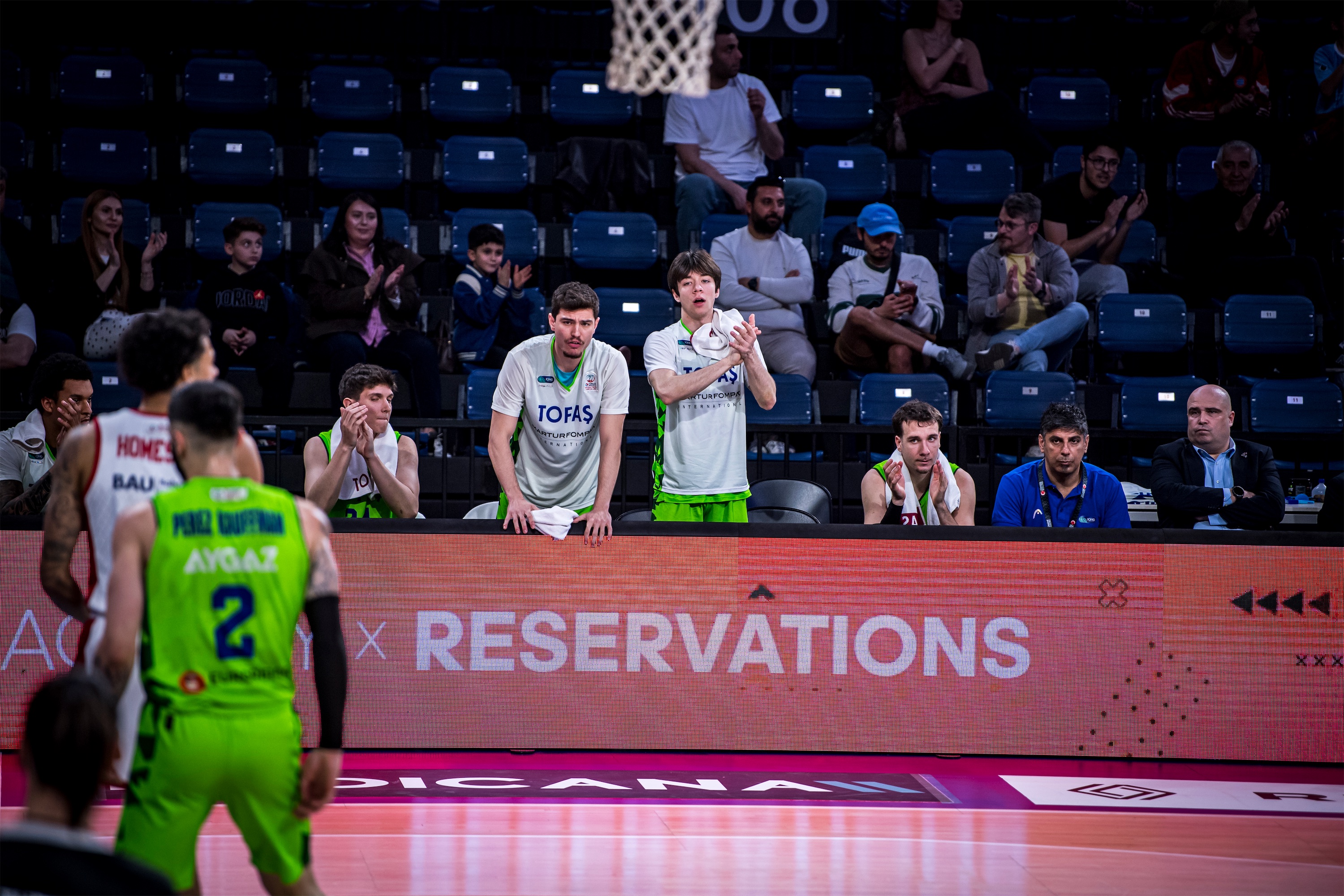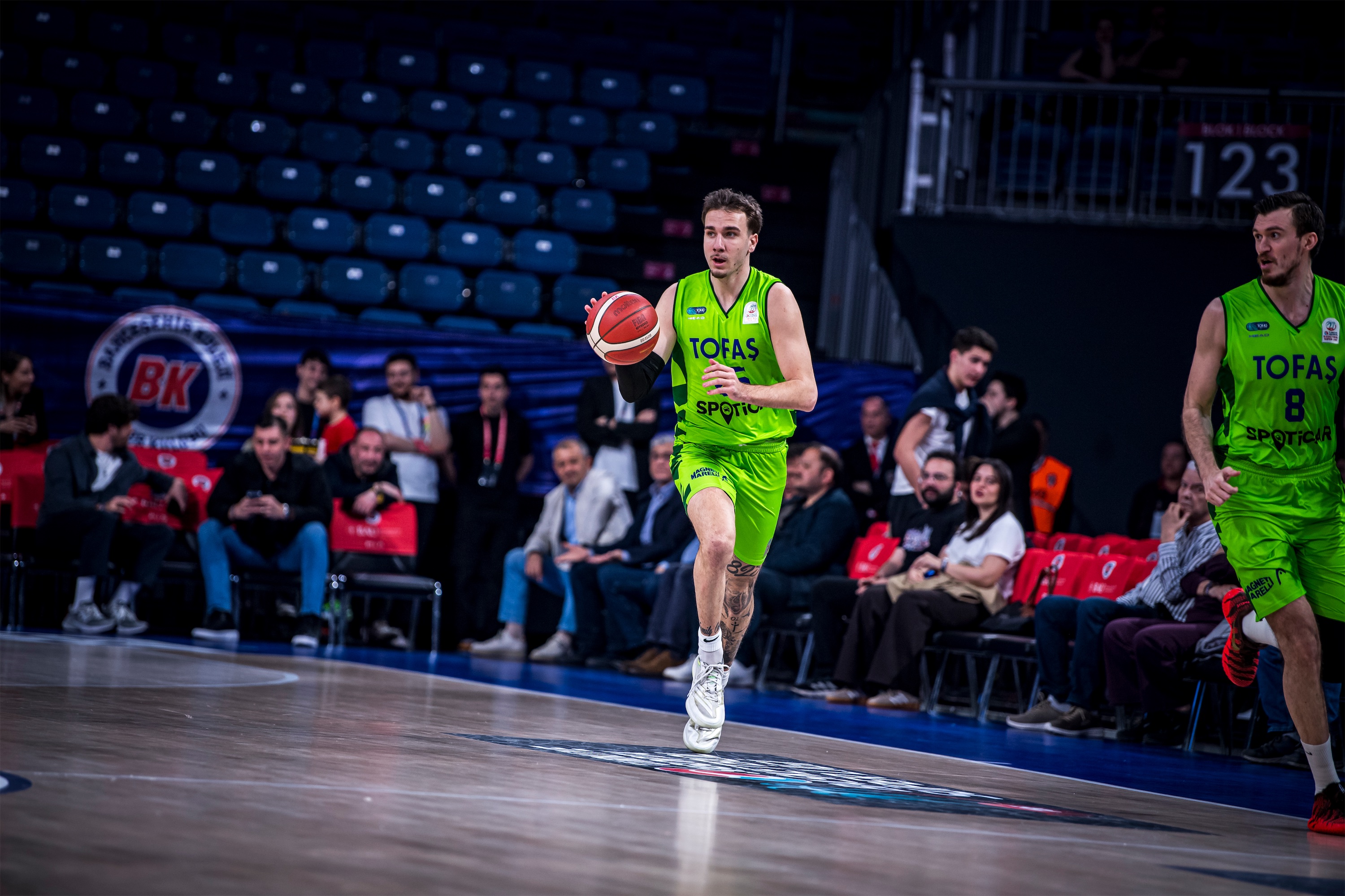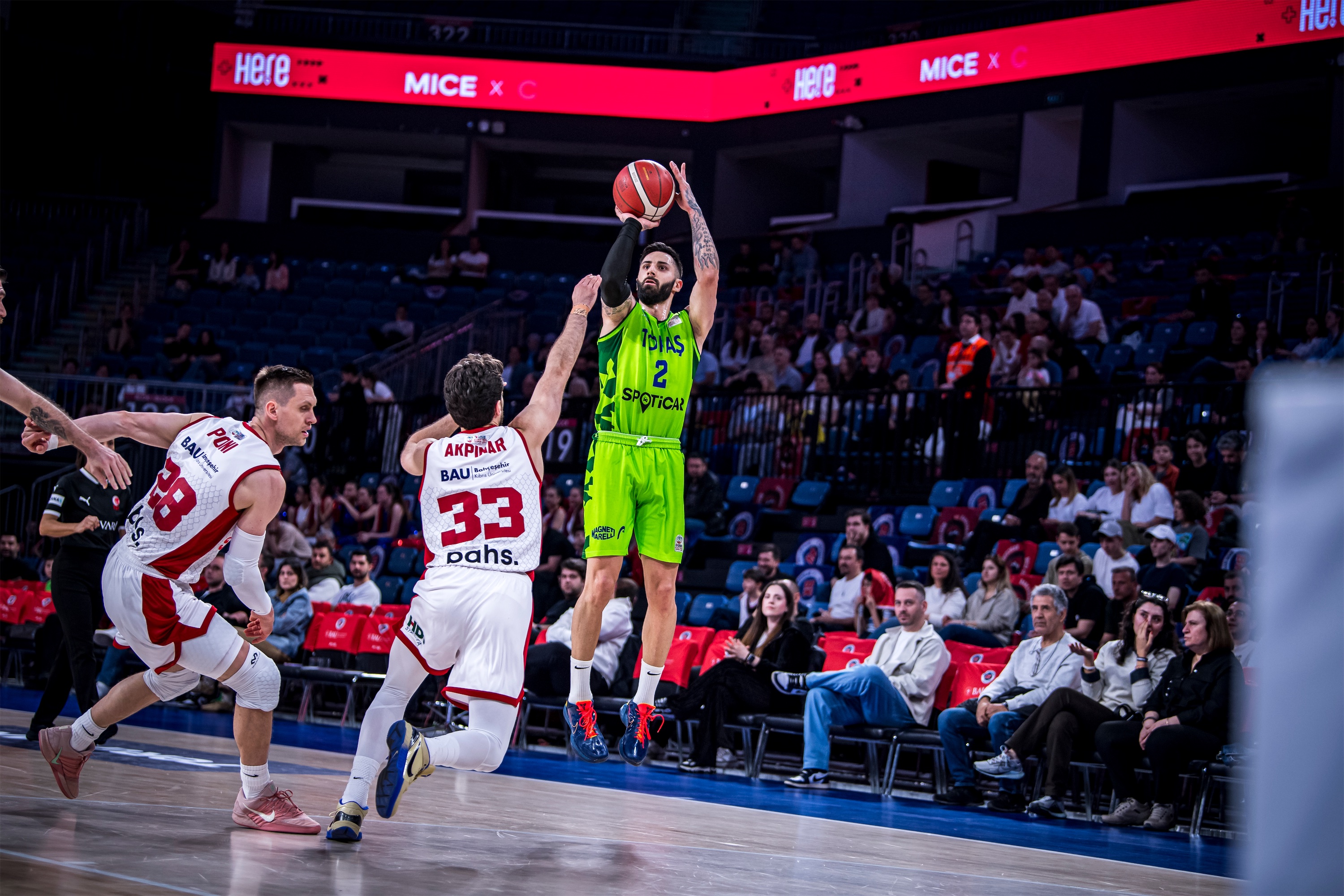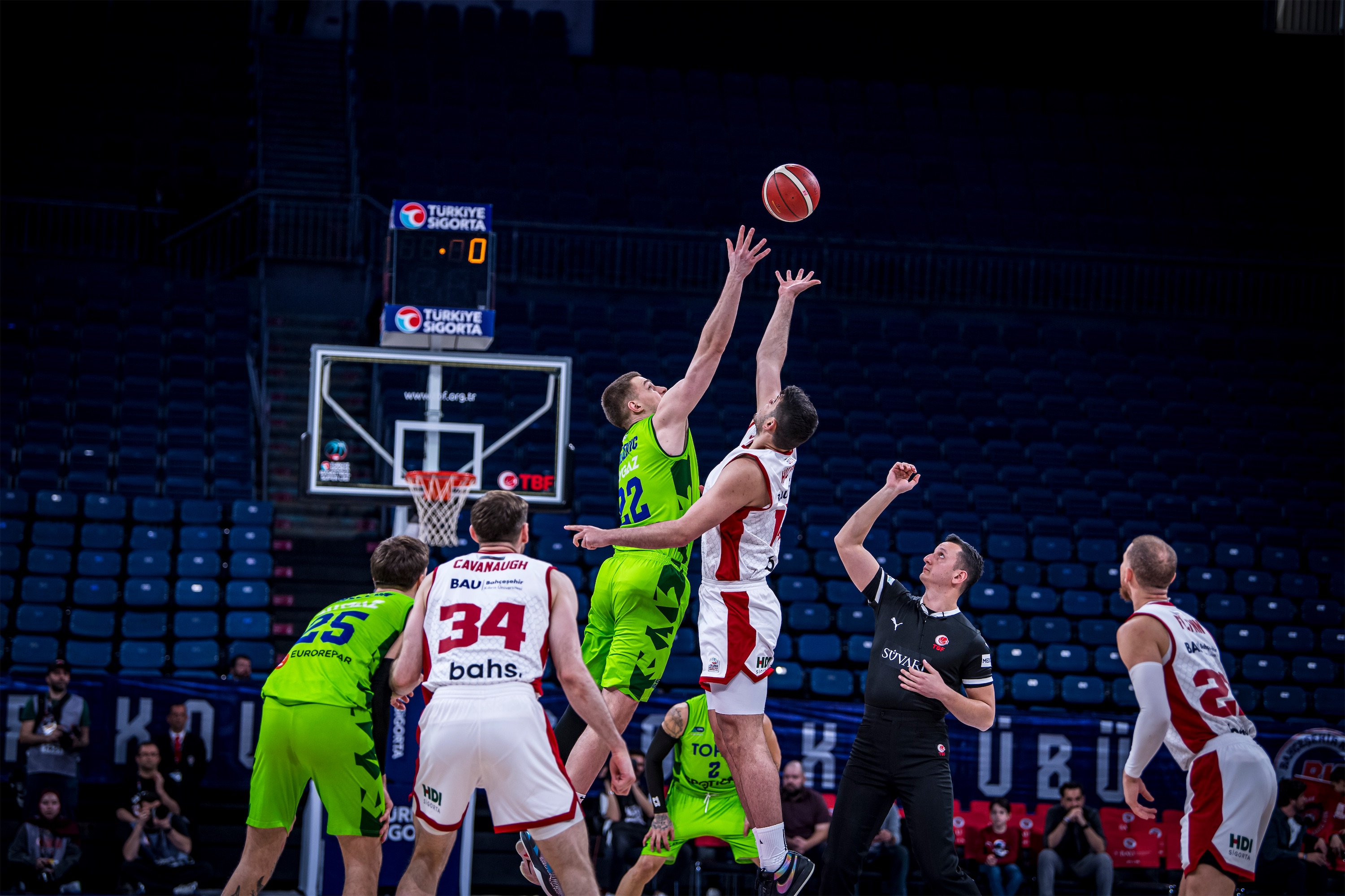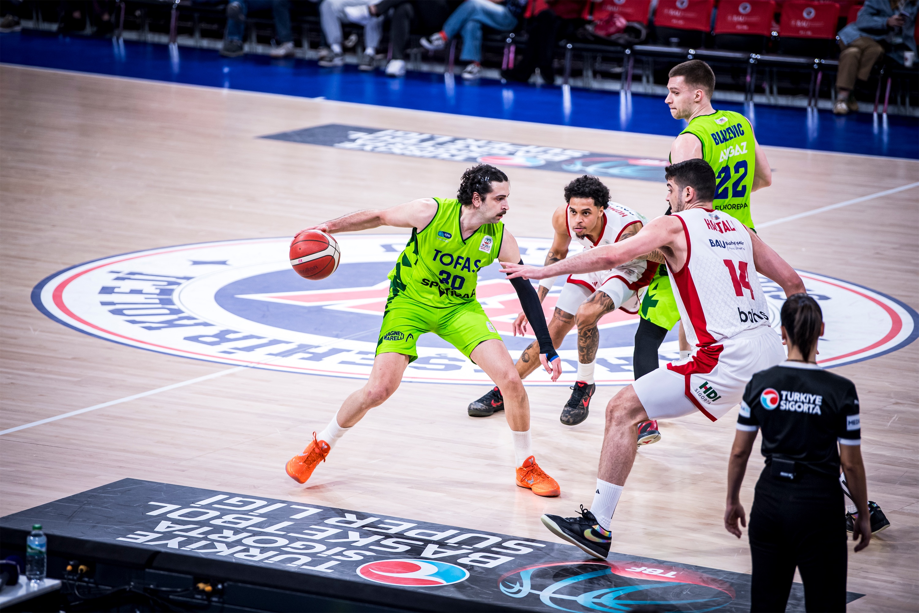 Türkiye Sigorta Basketbol Süper Ligi 28. haftasında takımımız TOFAŞ, Bahçeşehir Koleji’ne konuk oldu. Sinan Erdem Spor Salonu’nda oynanan maça Alex Perez, Hugo Besson, Tolga Geçim, Yiğitcan Saybir, Marek Blazevic beşiyle başlayan Mavi Yeşilliler, ilk basketlerini Alex Perez ve Marek Blazevic ile buldu. Rakip sayıları karşısında Marek Blazevic ve Yiğitcan Saybir’in sayılarıyla skoru 7-12’ye taşıyan Bursa temsilcisi, televizyon molası dönüşü rakip sayılarına engel olamayınca 8. dakikada 17-12 geriye düştü. Rakibin 10-0’lık serisine Hugo Besson’un serbest atış sayıları son verirken, ilk çeyrek 19-14 ev sahibi takımın üstünlüğüyle sonuçlandı.