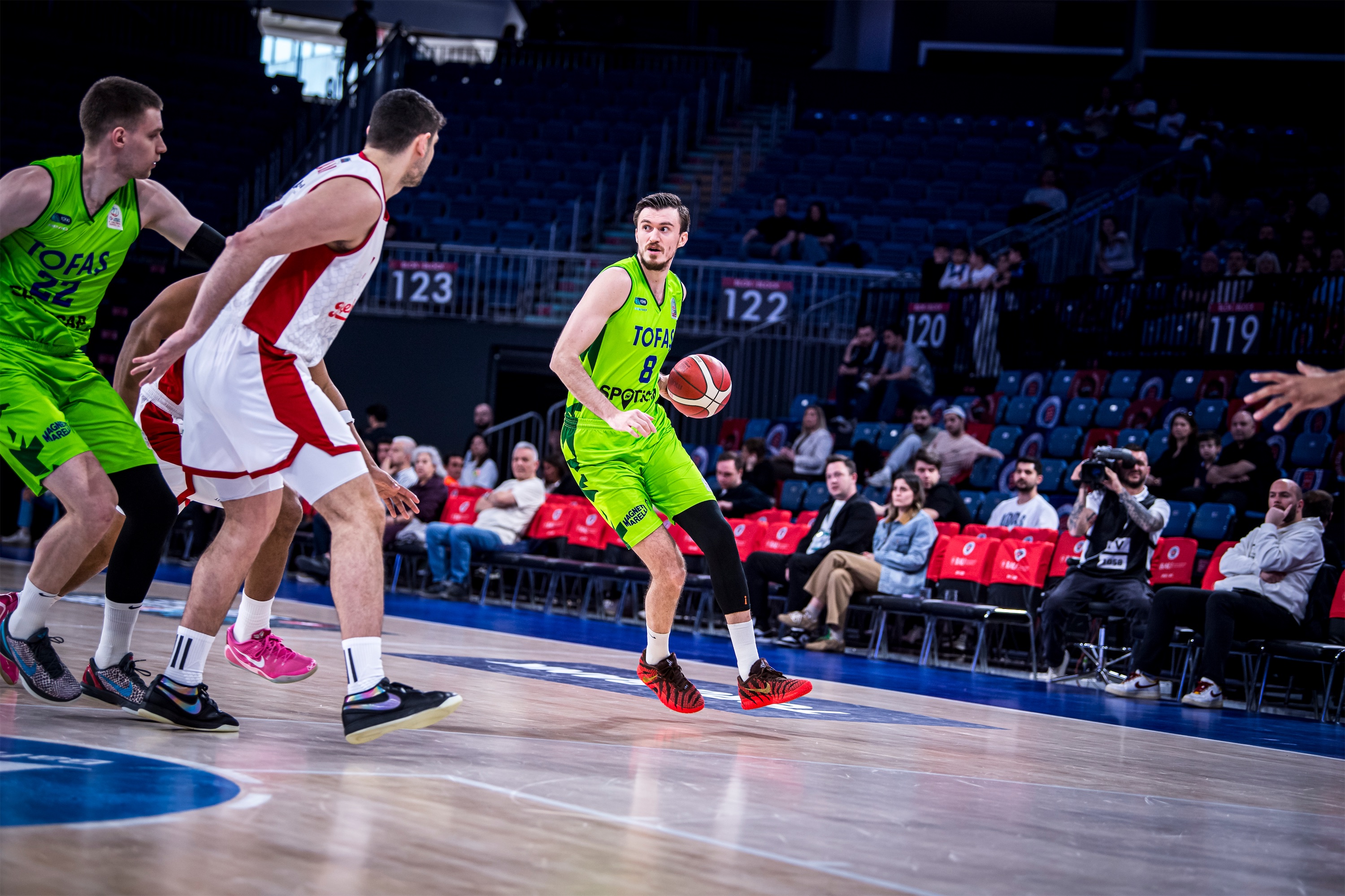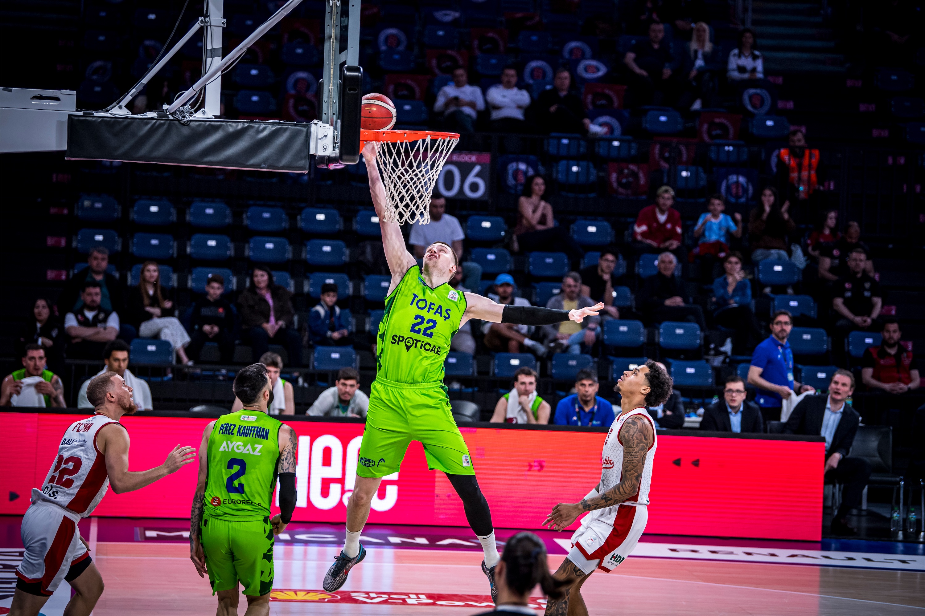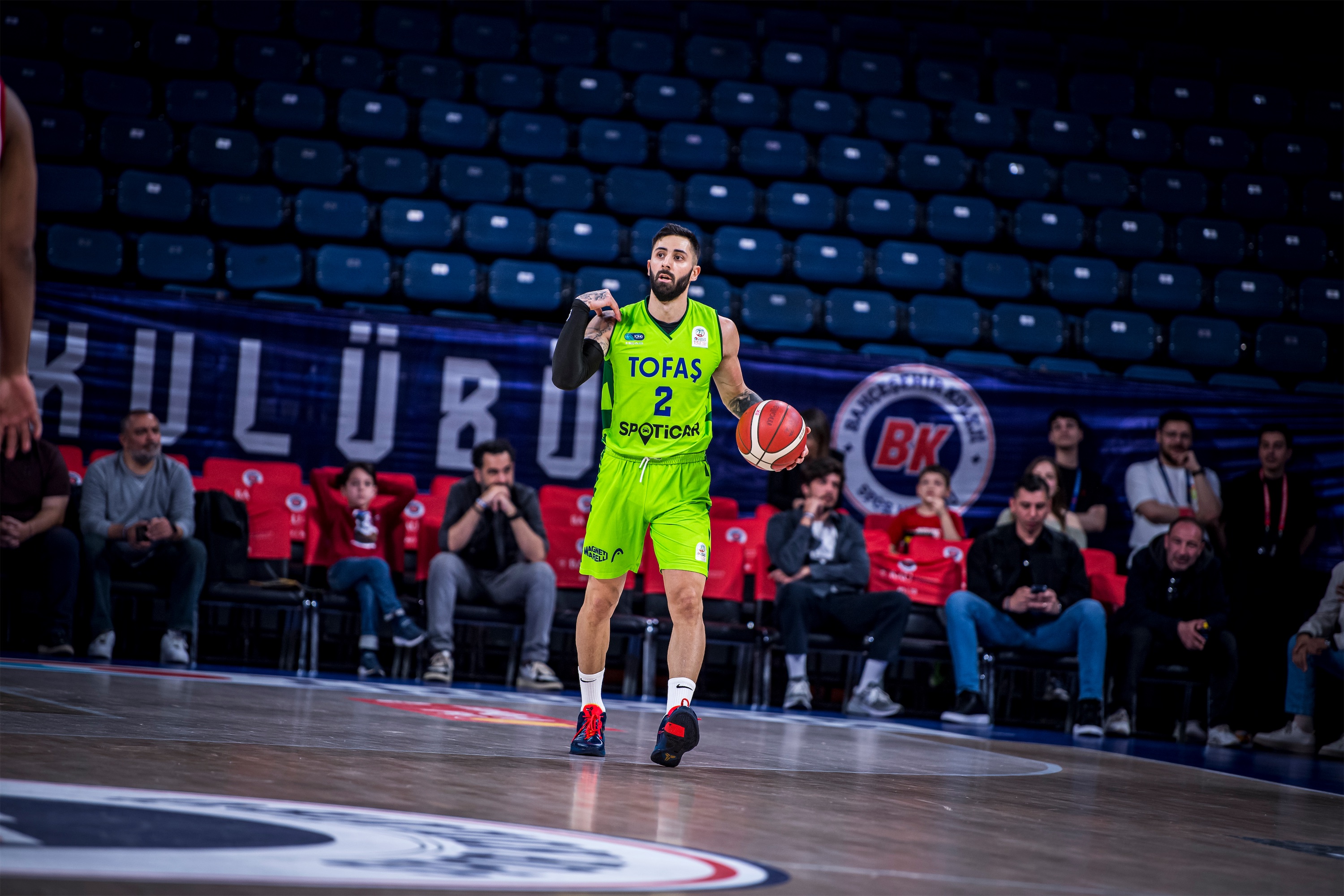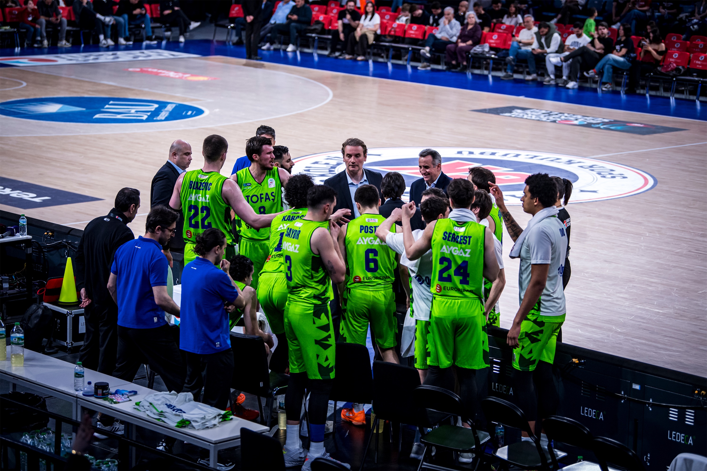 Türkiye Sigorta Basketbol Süper Ligi 28. haftasında takımımız TOFAŞ, Bahçeşehir Koleji’ne konuk oldu. Sinan Erdem Spor Salonu’nda oynanan maça Alex Perez, Hugo Besson, Tolga Geçim, Yiğitcan Saybir, Marek Blazevic beşiyle başlayan Mavi Yeşilliler, ilk basketlerini Alex Perez ve Marek Blazevic ile buldu. Rakip sayıları karşısında Marek Blazevic ve Yiğitcan Saybir’in sayılarıyla skoru 7-12’ye taşıyan Bursa temsilcisi, televizyon molası dönüşü rakip sayılarına engel olamayınca 8. dakikada 17-12 geriye düştü. Rakibin 10-0’lık serisine Hugo Besson’un serbest atış sayıları son verirken, ilk çeyrek 19-14 ev sahibi takımın üstünlüğüyle sonuçlandı.